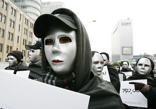 1月16日,韓國一些民眾頭帶面具聚集在首爾以色列使館前進行示威,抗議以色列襲擊加沙。