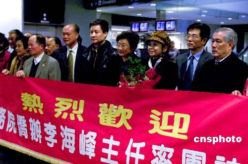 當(dāng)?shù)貢r(shí)間二月十日,中國(guó)國(guó)務(wù)院僑辦主任李海峰率領(lǐng)“文化中國(guó)·四海同春”藝術(shù)團(tuán)一行抵達(dá)舊金山,開始為期四天的藝術(shù)之旅,與當(dāng)?shù)厝A人華僑共慶新春。中國(guó)駐舊金山總領(lǐng)事高占生、華商總會(huì)會(huì)長(zhǎng)黃錫海及顧問池洪湖、魏需遜等僑界代表到機(jī)場(chǎng)迎接。 中新社發(fā) 陳鋼 攝
