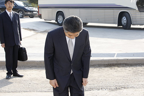 4月30日,韓國前總統(tǒng)盧武鉉從位于首都首爾東南約450公里的家中離開,準(zhǔn)備接受檢察機(jī)關(guān)的質(zhì)詢時向媒體記者鞠躬。