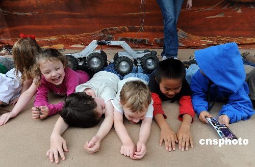 美國國家航空航天局(NASA)下屬的噴氣推進(jìn)實(shí)驗(yàn)室(JPL)當(dāng)?shù)貢r(shí)間五月二日對(duì)公眾開放,當(dāng)?shù)財(cái)?shù)千民眾不懼潛在的“豬流感”威脅,參觀這座代表美國尖端航天科技的科研基地。圖為兒童體驗(yàn)月球車模型的爬坡技能。噴氣推進(jìn)實(shí)驗(yàn)室位于洛杉磯附近的帕薩迪納市,目前主要從事太陽系行星探測(cè)任務(wù)等。中新社發(fā) 張煒 攝