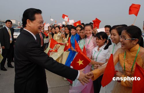 十月二十七日下午,越南總理阮晉勇飛抵廣西南寧市,出席十月二十八日開幕的第四屆中國—東盟博覽會。在南寧國際機(jī)場,阮晉勇與迎候在停機(jī)坪上的越南留學(xué)生親切握手。中新社發(fā) 蔣雪林 攝