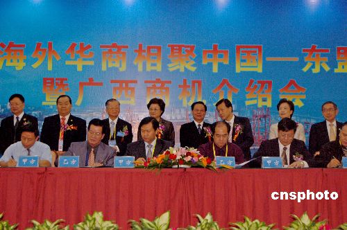十月二十九日,二〇〇七海外華商相聚中國—東盟博覽會暨廣西商機(jī)介紹會在廣西南寧舉行,兩百名華商參加會議,會上簽約十八個項(xiàng)目,金額三點(diǎn)八六億美元。中新社發(fā) 劉萬強(qiáng) 攝