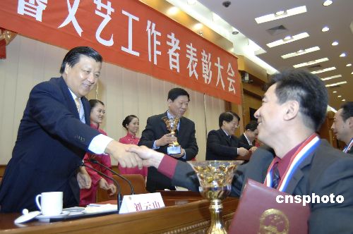 11月5日,中央宣傳部、人事部、中國文聯(lián)聯(lián)合在北京人民大會堂隆重舉行第二屆全國中青年德藝雙馨文藝工作者表彰大會,56位藝術家榮獲“全國中青年德藝雙馨文藝工作者”榮譽稱號。中新社發(fā) 徐曦弋 攝