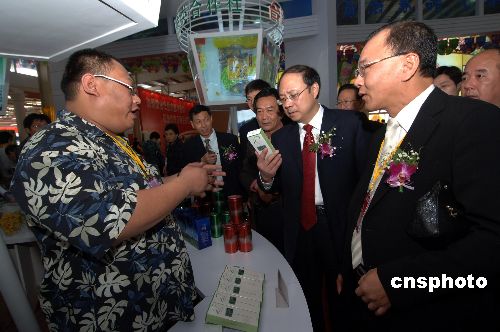 十一月十八日,臺灣商人陳志惟(左一)在閩臺農(nóng)業(yè)合作成果館里向國務(wù)院臺辦副主任鄭立中(右二)介紹自己的產(chǎn)品。當(dāng)日,第九屆海峽兩岸(福建漳州)花卉博覽會(huì)暨農(nóng)業(yè)合作洽談會(huì)在福建漳州花博園開幕。中新社發(fā) 王東明 攝