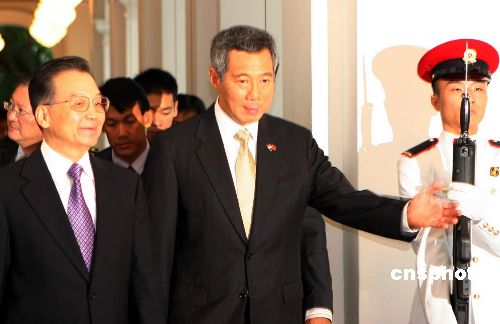 新加坡總理李顯龍十一月十八日下午在總統(tǒng)府前廣場(chǎng)舉行儀式,歡迎到訪的中國(guó)國(guó)務(wù)院總理溫家寶。溫家寶總理當(dāng)天下午乘專(zhuān)機(jī)抵達(dá)新加坡,旋即展開(kāi)訪新行程。歡迎儀式后,溫家寶與李顯龍舉行了會(huì)談,兩國(guó)總理對(duì)加強(qiáng)中新關(guān)系、推進(jìn)重點(diǎn)領(lǐng)域合作以及共同關(guān)心的國(guó)際和地區(qū)問(wèn)題交換了意見(jiàn),共同出席了中新《生態(tài)城框架協(xié)定》的簽字儀式。這是應(yīng)李顯龍的邀請(qǐng),中國(guó)國(guó)務(wù)院總理八年來(lái)的首次訪問(wèn)新加坡。中新社發(fā) 周群 攝