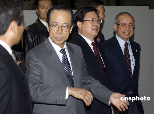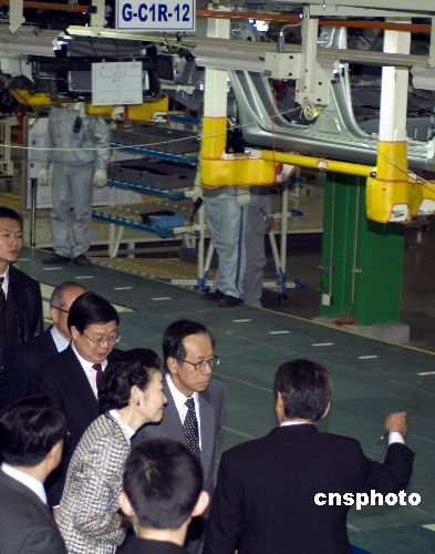 應(yīng)邀訪華的日本首相福田康夫(左二)在天津市代理市長黃興國(右二)的陪同下,前往位于天津濱海新區(qū)的天津一汽豐田有限公司參觀訪問。