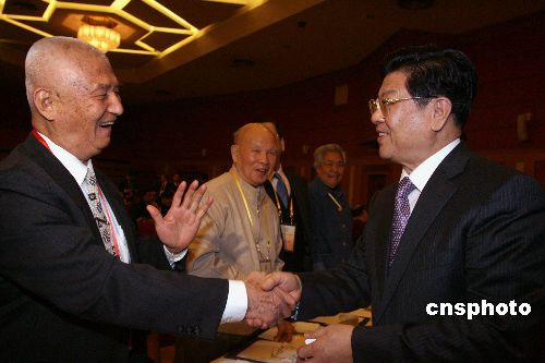 1月10日,中國僑聯(lián)七屆五次全委會議在北京舉行,中共中央政治局委員、全國人大常委會副委員長王兆國出席會議并作重要講話。圖為王兆國(右一)與全國僑聯(lián)顧問莊炎林(左一)握手交談。中新社發(fā) 張勤 攝