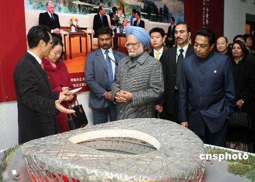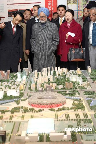 圖:印度總理辛格參觀北京奧運(yùn)會場館建設(shè)