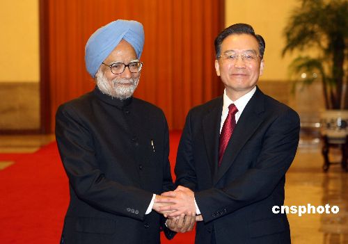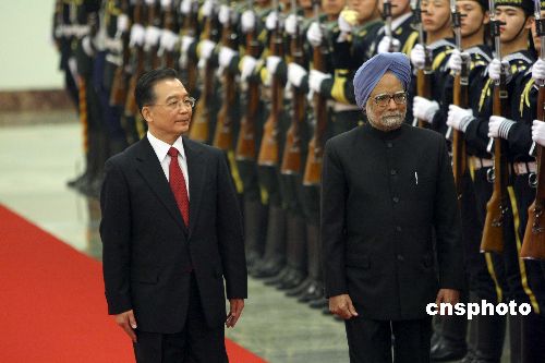 1月14日,中國(guó)國(guó)務(wù)院總理溫家寶在北京人民大會(huì)堂舉行儀式,歡迎來訪的印度總理辛格。中新社發(fā) 盛佳鵬 攝