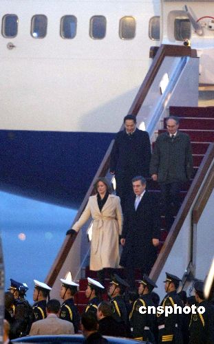 應中國國務院總理溫家寶邀請,英國首相戈登·布朗1月18日清晨乘專機抵達北京,開始對中國進行為期3天的正式訪問。這是布朗2007年6月就任英國首相以來首次訪華,隨行人員包括夫人沙拉·布朗,多位政府高級官員以及30余位隨行企業(yè)家。布朗也是2008年首位訪華的歐洲國家領導人。中新社發(fā) 盛佳鵬 攝