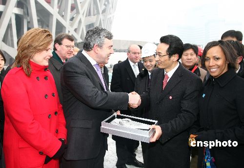1月19日,英國首相布朗攜夫人薩拉·布朗以及英國著名女運(yùn)動(dòng)員、雅典奧運(yùn)會(huì)冠軍凱莉·霍爾姆斯等,參觀2008年北京奧運(yùn)會(huì)主體育場“鳥巢”。北京市副市長陳剛向布朗贈(zèng)送了“鳥巢”模型。中新社發(fā) 盛佳鵬 攝
