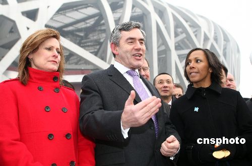 布朗攜夫人薩拉·布朗(左一)以及英國著名女運(yùn)動(dòng)員、雅典奧運(yùn)會(huì)冠軍凱莉·霍爾姆斯(右一)等,參觀2008年北京奧運(yùn)會(huì)主體育場“鳥巢”。