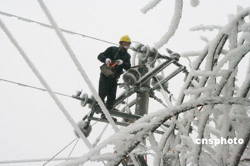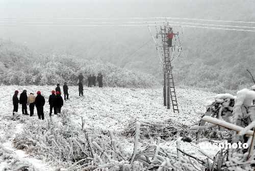 1月20至21日,黔東南州各縣電力職工在搶修受冰凍災(zāi)害的電力設(shè)施。連日來,由于持續(xù)出現(xiàn)大范圍雪凝天氣,貴州省黔東南州境內(nèi)的凱里電網(wǎng)(轄管黔東南州各縣市)遭遇自1984年以來最為嚴(yán)重的冰凍災(zāi)害,凱里電網(wǎng)部門及下屬的15家縣局已緊急采取措施,確保電網(wǎng)穩(wěn)定運行。1月14日以來,貴州黔東南地區(qū)溫度均在零下1攝氏度,是24年以來最為嚴(yán)重的一次,出現(xiàn)嚴(yán)重的覆冰。覆冰導(dǎo)致一些輸電設(shè)施桿塔和導(dǎo)地線不堪重負(fù)而倒塔斷線,電網(wǎng)設(shè)施受損嚴(yán)重。截止1月21日,凱里電網(wǎng)出現(xiàn)孤網(wǎng)運行,各縣農(nóng)網(wǎng)線路等輸配電線路都不同程度出現(xiàn)倒桿斷線的情況,造成黔東南州南部電網(wǎng)七個縣全部停電。冰災(zāi)發(fā)生后,凱里電網(wǎng)部門迅速啟動“抗冰保電”應(yīng)急預(yù)案,同時在當(dāng)?shù)孛襟w發(fā)布停電預(yù)警公告,并積極做好醫(yī)院、交通、通訊、礦山等重要客戶的安全用電工作。中新社發(fā) 吳如雄 攝