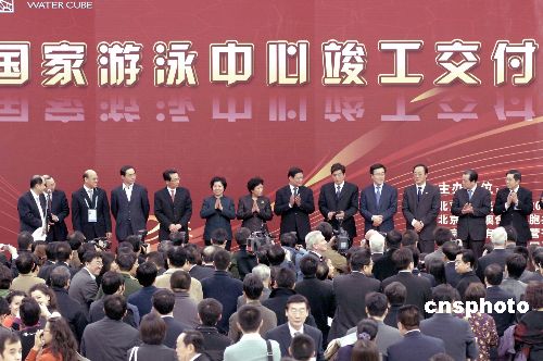 1月28日,作為北京奧運會標(biāo)志性場館的國家游泳中心(“水立方”)宣布竣工。北京市委書記劉淇、市長郭金龍等出席竣工儀式。這個歷時4年多時間建成的水藍色建筑即將投入“好運北京”賽事使用。中新社發(fā) 徐曦弋 攝