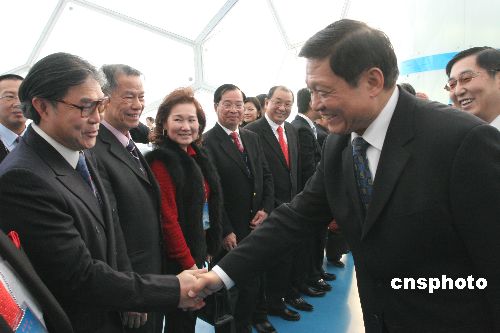 一月二十八日上午,在剛剛竣工的國家游泳中心內(nèi),北京市港澳臺僑同胞共建北京奧運場館委員會舉行第八次向國家游泳中心(“水立方”)撥付捐款資金儀式。中共中央政治局委員、中共北京市委書記劉淇在儀式上與捐資人代表香港奧委會主席霍震霆握手。中新社發(fā) 王海波 攝
