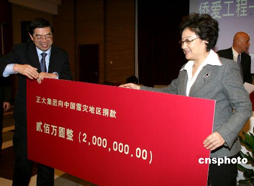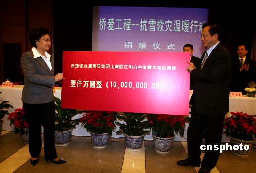 1月31日,新成立的中國(guó)僑商投資企業(yè)協(xié)會(huì)在北京發(fā)出倡議,希望廣大僑商積極行動(dòng)起來(lái),為抗雪救災(zāi)伸出援助之手,得到了來(lái)自泰國(guó)、新加坡、香港、澳門(mén)等十多家僑商投資企業(yè)的積極響應(yīng)。 中國(guó)僑商投資企業(yè)協(xié)會(huì)常務(wù)副會(huì)長(zhǎng)、新加坡金鷹國(guó)際集團(tuán)主席陳江和先生第一個(gè)對(duì)倡議作出響應(yīng)。在國(guó)務(wù)院僑辦舉行的“僑愛(ài)工程——抗雪救災(zāi)溫暖行動(dòng)”捐贈(zèng)儀式上,陳江和先生慷慨捐贈(zèng)了1000萬(wàn)元,中國(guó)僑商投資企業(yè)協(xié)會(huì)會(huì)長(zhǎng)、泰國(guó)正大集團(tuán)董事長(zhǎng)謝國(guó)民先生和中國(guó)僑商投資企業(yè)協(xié)會(huì)副會(huì)長(zhǎng)、福耀玻璃工業(yè)集團(tuán)董事局主席曹德旺先生分別捐贈(zèng)了200萬(wàn)元。目前更多善款還在匯集中。這些款項(xiàng)將通過(guò)國(guó)務(wù)院僑辦轉(zhuǎn)送受災(zāi)地區(qū)人民政府。國(guó)務(wù)院僑辦主任李海峰等出席捐贈(zèng)儀式。中新社發(fā) 張勤 攝