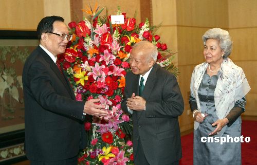 2月4日,受中國國家主席胡錦濤和國務院總理溫家寶的委托,國務委員唐家璇專程看望在北京的柬埔寨太皇諾羅敦·西哈努克和太后諾羅敦·莫尼列·西哈努克。中新社發(fā) 盛佳鵬 攝