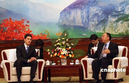 2月26日,英國(guó)外交大臣戴維·米利班德一行抵渝進(jìn)行訪問(wèn)。據(jù)稱,此次訪問(wèn)重點(diǎn)是了解重慶市政府在縮小城鄉(xiāng)差距領(lǐng)域所作出的努力,戴維·米利班德一行將實(shí)地走訪重慶建筑工地和農(nóng)村,了解當(dāng)?shù)剞r(nóng)民、農(nóng)民工及其子女的生活教育狀況。圖為重慶市常務(wù)副市長(zhǎng)黃奇帆(右一)會(huì)見戴維·米利班德(左一)。中新社發(fā) 郭晉嘉 攝