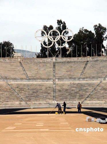 北京奧運(yùn)會(huì)圣火采集和火炬?zhèn)鬟f的籌備工作正在希臘緊張地進(jìn)行中。圖為雅典第一屆現(xiàn)代奧運(yùn)會(huì)會(huì)場(chǎng)正在為即將于本月底舉行的火炬交接儀式做準(zhǔn)備,工人正在體育場(chǎng)中心鋪設(shè)奧運(yùn)五環(huán)標(biāo)志。該體育場(chǎng)能容納兩萬(wàn)人。中新社發(fā) 鐘誠(chéng) 攝