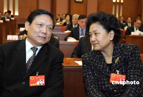 3月11日,十一屆全國人大一次會議主席團在北京舉行第二次會議,劉淇、劉延東(右)出席。中新社發(fā) 任晨鳴 攝