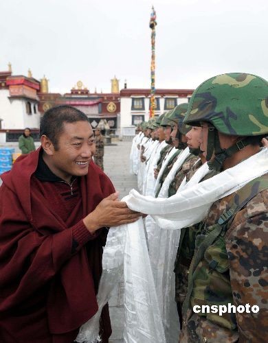 拉薩大昭寺的僧人向在大昭寺廣場(chǎng)上執(zhí)勤的武警官兵敬獻(xiàn)哈達(dá)