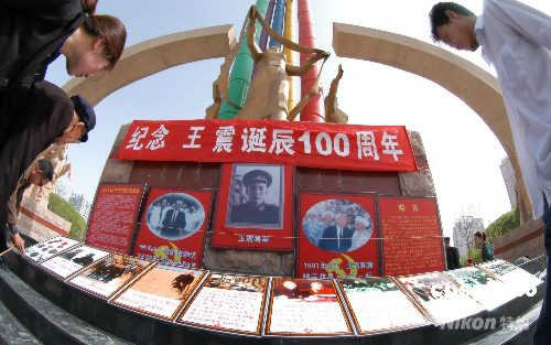 4月11日下午,是王震同志誕辰100周年紀(jì)念日。新疆巴州紅色收藏家陳伯壽在庫爾勒人民廣場免費(fèi)展出王震圖片和資料。當(dāng)日,新疆各地州舉辦座談會、展出王震圖片和資料等形式紀(jì)念王震同志誕辰100周年。中新社發(fā) 確·胡熱 攝