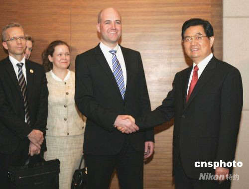 4月12日下午,海南省博鰲,中國國家主席胡錦濤會(huì)見來華訪問并出席博鰲亞洲論壇2008年年會(huì)開幕式的瑞典首相弗雷德里克·賴因費(fèi)爾特以及隨行人員。中新社發(fā) 任晨鳴 攝