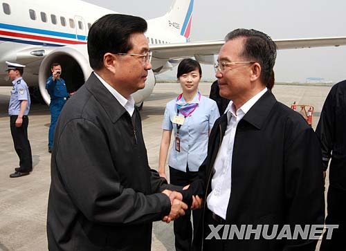 5月16日,中共中央總書記、國家主席、中央軍委主席胡錦濤乘飛機抵達四川綿陽,慰問災區(qū)干部群眾,看望抗震救災一線的部隊官兵和醫(yī)護人員。國務院總理溫家寶到機場迎接胡錦濤。 新華社記者鞠鵬攝