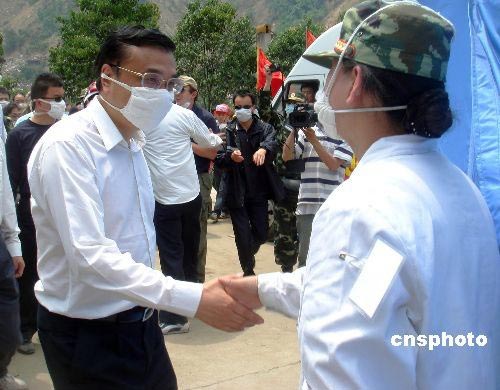 5月19日下午,中共中央政治局常委、國務(wù)院副總理李克強來到北川縣城救災(zāi)現(xiàn)場,視察指導(dǎo)現(xiàn)場救援工作,李克強在察看了北川縣受災(zāi)全貌后,慰問了在重慶消防總隊醫(yī)院在北川縣城救援點設(shè)置的急救帳篷里工作的官兵。中新社發(fā) 陳誠 攝