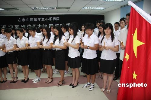 五月二十一日上午,中國駐泰大使館教育組吊唁堂燭光點(diǎn)點(diǎn),哀思眷眷。來自泰國易三倉大學(xué)、亞洲理工學(xué)院、泰國商會大學(xué)、曼頌德皇家大學(xué)、農(nóng)業(yè)大學(xué)、蘭實(shí)大學(xué)、拉查蒙坤大學(xué)、東亞大學(xué)等曼谷及周邊地區(qū)近十所大學(xué)的六十多名中國留學(xué)生代表,手持點(diǎn)燃的蠟燭,默默地向汶川地震遇難同胞表達(dá)哀悼之情。