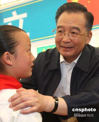 5月23日上午9時(shí)許,國務(wù)院總理溫家寶來到四川綿陽,在九洲帳篷學(xué)校看望地震災(zāi)區(qū)學(xué)生。中新社發(fā) 趙振清 攝