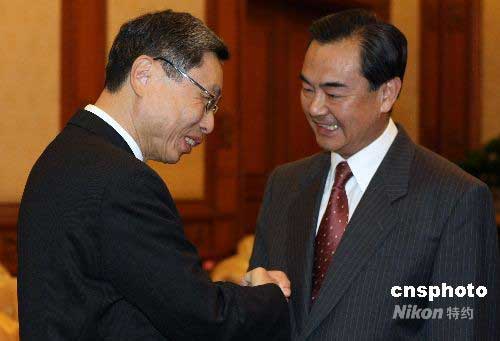 6月12日晚,新任中臺辦、國臺辦主任王毅(右)在北京釣魚臺會見并宴請臺灣海峽交流基金會董事長江丙坤一行。會見時(shí),王毅與;鶗倍麻L高孔廉親切交談。中新社發(fā) 任晨鳴 攝