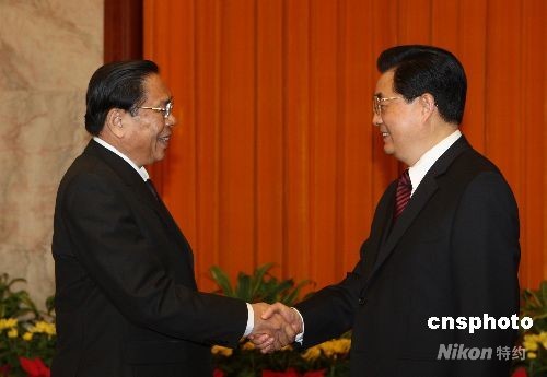 8月7日,中國國家主席胡錦濤在北京人民大會堂會見應(yīng)邀出席北京奧運會開幕式的老撾國家主席朱馬里。中新社發(fā) 廖文靜 攝