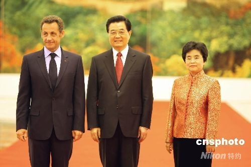 8月8日中午,中國(guó)國(guó)家主席胡錦濤和夫人劉永清在北京人民大會(huì)堂為出席北京奧運(yùn)會(huì)的貴賓舉行歡迎宴會(huì)。圖為胡錦濤夫婦歡迎法國(guó)總統(tǒng)薩科齊。中新社發(fā) 任海霞 攝