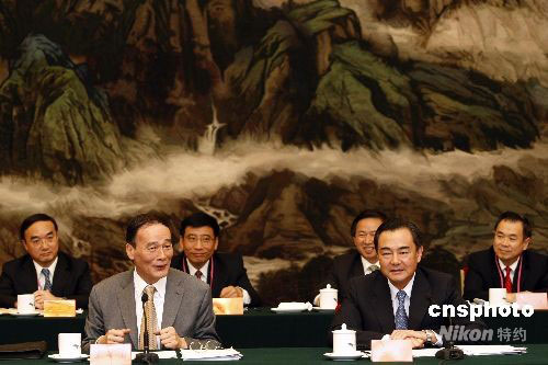 8月28日,2008年臺商座談會在北京人民大會堂舉行。國務(wù)院副總理王岐山和國務(wù)院20多個主要部門負(fù)責(zé)人及60多位臺灣工商界人士、大陸臺商代表參加座談。中共中央臺辦、國務(wù)院臺辦主任王毅主持會談。中新社發(fā) 盛佳鵬 攝