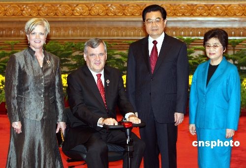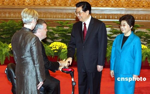 九月六日,國家主席胡錦濤夫婦在北京人民大會(huì)堂歡迎出席2008年殘奧會(huì)的各國貴賓。圖為胡錦濤夫婦歡迎加拿大安大略省省督戴維·C·翁利。中新社發(fā) 任海霞 攝