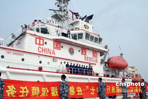 9月21日下午,中國(guó)裝備最先進(jìn)、救助功能最全的大馬力遠(yuǎn)洋專用救助船“南海救一一二”輪一切準(zhǔn)備就緒,從上海外高橋碼頭出征西太平洋海域,待命深海執(zhí)行神舟七號(hào)載人航天飛行任務(wù)海上應(yīng)急救援任務(wù)。中新社發(fā) 陸從兵 攝