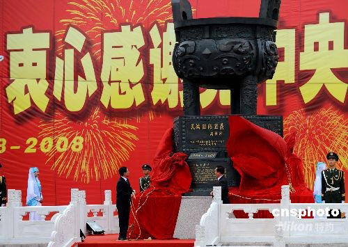 9月22日,中共中央政治局常委、中央紀委書記賀國強(左),與寧夏回族自治區(qū)黨委書記陳建國,一同為中央贈送寧夏的民族團結寶鼎揭幕。當日上午,以賀國強為團長的中央代表團乘專機抵達銀川,參加寧夏回族自治區(qū)成立50周年慶祝活動。中新社發(fā) 廖攀 攝