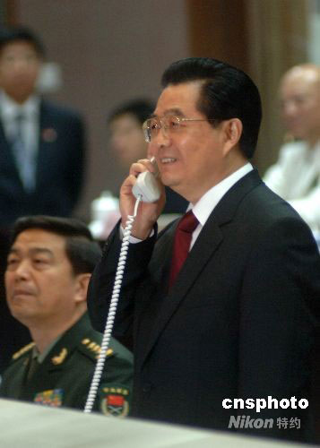 九月二十七日下午,神舟七號(hào)載人飛船翟志剛等三名航天員成功完成中國(guó)首次太空出艙活動(dòng)后,親臨北京航天飛行控制中心觀看中國(guó)人這一歷史性壯舉的中共中央總書(shū)記、國(guó)家主席、中央軍委主席胡錦濤,與航天員們進(jìn)行了天地通話(huà)。中新社發(fā) 張桐勝 攝