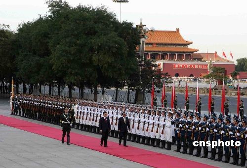 10月15日下午,中國國家主席胡錦濤在北京人民大會堂東門外廣場舉行儀式,歡迎巴基斯坦總統(tǒng)扎爾達(dá)里訪華。扎爾達(dá)里總統(tǒng)是應(yīng)胡錦濤的邀請從10月14日至17日對中國進(jìn)行國事訪問,這是扎爾達(dá)里就任總統(tǒng)后的首次正式出訪。中新社發(fā) 任晨鳴 攝