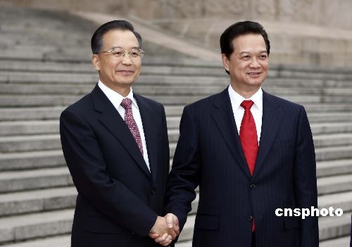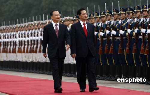 10月22日,中國(guó)國(guó)務(wù)院總理溫家寶在北京人民大會(huì)堂東門外廣場(chǎng)舉行儀式,歡迎越南總理阮晉勇。中新社發(fā) 盛佳鵬 攝