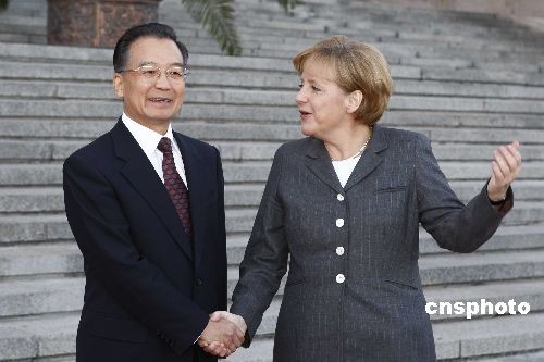 10月23日,中國(guó)國(guó)務(wù)院總理溫家寶在北京人民大會(huì)堂東門外廣場(chǎng)舉行儀式,歡迎德國(guó)總理默克爾。中新社發(fā) 盛佳鵬 攝