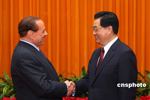 10月23日,北京人民大會(huì)堂,中國(guó)國(guó)家主席胡錦濤會(huì)見(jiàn)前來(lái)出席第七屆亞歐首腦會(huì)議的意大利總理貝盧斯科尼。中新社發(fā) 廖文靜 攝