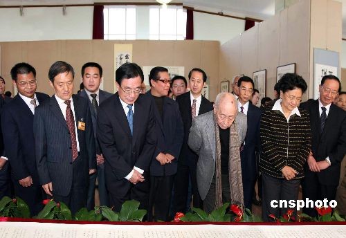 中共中央政治局常委、中央紀(jì)委書記賀國(guó)強(qiáng),中共中央政治局委員、國(guó)務(wù)委員劉延?xùn)|,中共中央書記處書記、中央紀(jì)委副書記何勇和著名畫家黃永玉等在北京軍事博物館一起參觀紀(jì)念黨的紀(jì)律檢查機(jī)關(guān)恢復(fù)重建30周年書畫展。中新社發(fā) 王保勝 攝
