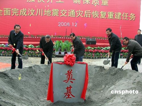 12月3日上午,在四川汶川大地震造成的滑坡山體邊,國(guó)道213線汶川至映秀公路的映秀施工現(xiàn)場(chǎng),汶川地震交通災(zāi)后恢復(fù)重建項(xiàng)目集中開工儀式舉行。交通運(yùn)輸部部長(zhǎng)李盛霖,四川省省長(zhǎng)蔣巨峰、副省長(zhǎng)王寧,四川省交通廳廳長(zhǎng)高烽等,揮锨為國(guó)道213線汶川至映秀段、省道303線臥龍至日隆段災(zāi)后重建項(xiàng)目奠基。中新社發(fā) 楊杰 攝