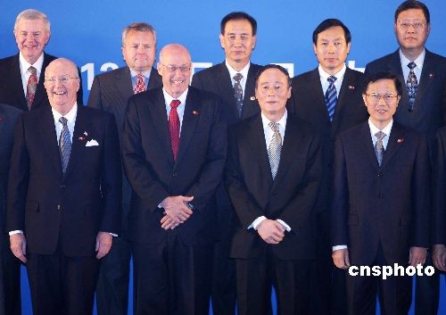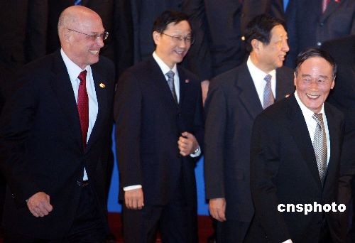 12月5日上午,第五次中美戰(zhàn)略經(jīng)濟對話在北京釣魚臺國賓館閉幕前,中國國務(wù)院副總理王岐山和美國財政部部長保爾森以及雙方與會人員合影留念。中美戰(zhàn)略經(jīng)濟對話是2006年9月由中國國家主席胡錦濤和美國總統(tǒng)布什發(fā)起設(shè)立的,是中美現(xiàn)有20多個磋商機制中級別最高的一個。對話每年兩次,輪流在中美舉行。中新社發(fā) 任晨鳴 攝