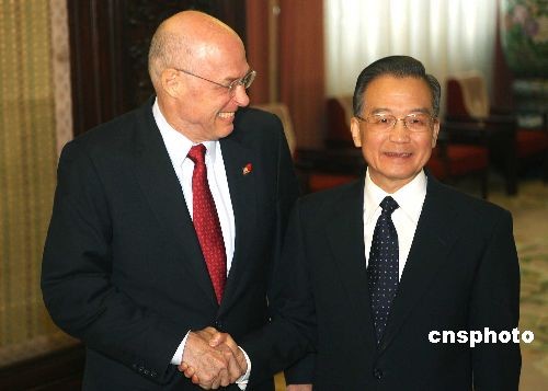圖為溫家寶與美國(guó)財(cái)政部長(zhǎng)保爾森握手。