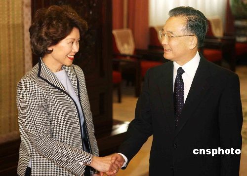 圖:溫家寶與美國(guó)勞工部部長(zhǎng)趙小蘭握手。