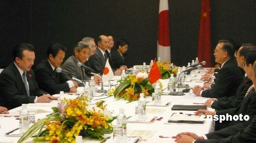 當(dāng)?shù)貢r(shí)間12月13日下午2點(diǎn)許,中國(guó)總理溫家寶與日本首相麻生太郎在位于福岡的九州國(guó)立博物館舉行會(huì)見(jiàn)。中新社發(fā) 朱沿華 攝