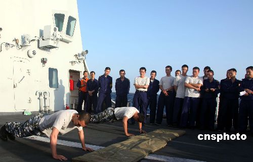 當(dāng)?shù)貢r間1月11日下午,正在亞丁灣海域執(zhí)行護(hù)航任務(wù)的“?凇碧枌(dǎo)彈驅(qū)逐艦舉行甲板運(yùn)動會最后兩個項(xiàng)目賽事,圖為參賽官兵參加俯臥撐項(xiàng)目比賽。中新社發(fā) 孫自法 攝